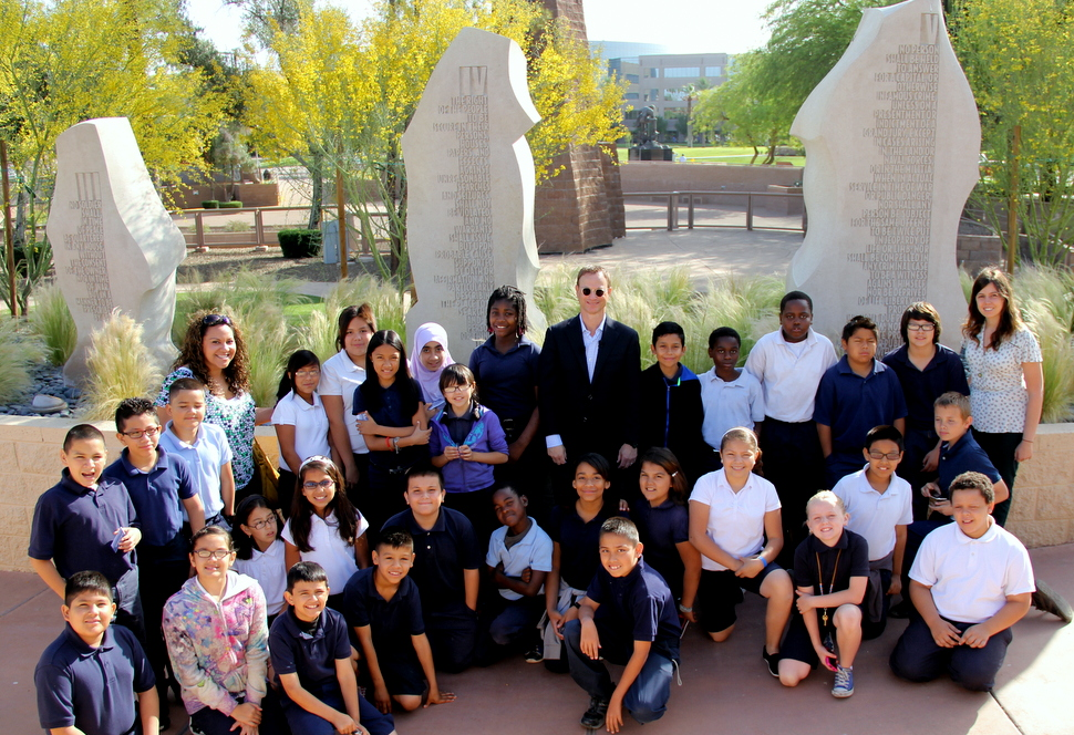 Actor and veterans advocate Gary Sinese visits with a class of 5th graders at The Bill of Rights Monument
